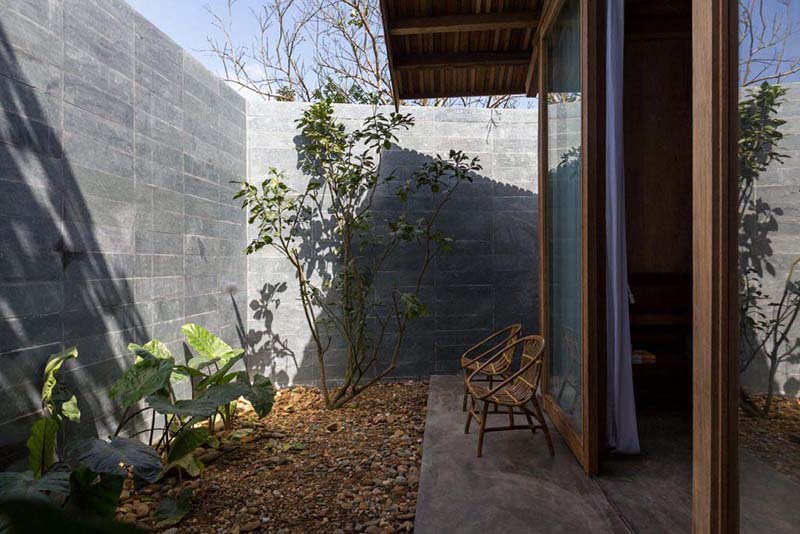 Hai phòng ngủ và phòng vệ sinh mang đến sự riêng tư và bầu không khí êm dịu. Bởi bức tường đá tự nhiên bao bọc xung quanh, tạo ra những khu vườn bên trong cho mỗi không gian.